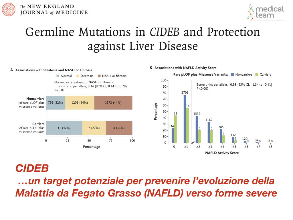 per una proteina coinvolta nella formazione di grosse vescicole di grasso a livello epatico) un elemento protettivo nei confronti della progressione della malattia di fegato e un potenziale candidato a un approccio di terapia genica (Verweij N et al . N Engl J Med 202; 387:322-344).